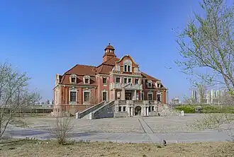 Das unter Denkmalschutz stehende alte Empfangsgebäude wurde 1909–1910 am Startpunkt der Jin-Pu-Bahn nach Pukou (nördlich von Nanjing) errichtet.[1] Dass Tianjin damals, auch nach Ende der Besatzung durch die Vereinigten acht Staaten noch unter Verwaltung der ehemaligen europäischen Besatzungsstaaten stand, zeichnet sich an der Architektur ab, die an den Stil deutscher Bahnhofsbauten angelehnt ist.