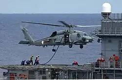 Es ist möglich, auf dem Deck Hubschrauber bis zur Größe eines Sikorsky MH-53 Sea Stallion oder Boeing-Vertol CH-47 Chinook zu landen. Außerdem können Helikopter bei belegtem Flugdeck in der Luft über einen Schlauch betankt werden. Die Hubschrauber können mittels einer Verfahr- und Fixierungsanlage auch bei schwerem Seegang landen und in den Hangar verbracht werden.