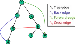 Die Kanten des Graphen, die vom Algorithmus zum Durchlaufen des Graphen benutzt werden, werden als Baumkanten bezeichnet. Diejenigen Kanten, die nicht benutzt werden und von einem Knoten zu einem anderen Knoten im selben Teilbaum führen, der bei der Tiefensuche später besucht wird, heißen Vorwärtskanten. Diejenigen Kanten, die nicht benutzt werden und von einem Knoten zu einem anderen Knoten im selben Teilbaum führen, der bei der Tiefensuche bereits vorher besucht wurde, heißen Rückwärtskanten. Diejenigen Kanten, die „quer“ von einem Teilbaum zu einem anderen Teilbaum verlaufen, heißen Querkanten. Innerhalb des Tiefensuchbaums würde der Pfad zwischen zwei über eine Querkante verbundenen Knoten zunächst ein Auf- und dann ein Absteigen im Baum erfordern. Vorwärtskanten, Rückwärtskanten, Querkanten und Baumkanten ergeben insgesamt die Kantenmenge des Graphen.