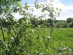 Die überschwemmten Großseggenwiesen, die die Tiefwerder-Wiesen lange dominierten, gehen aufgrund der immer selteneren Überflutungen zurück. Die bis zu zwei Meter hohe Ufer-Segge ist noch an den Gewässerrändern anzutreffen. Aus der Gattung der Seggen prägen heute Schlankseggenriede die vernässten Wiesenbereiche und Brachen. Die Kennart der Pflanzengesellschaft, die Schlank-Segge, ist eine mehrjährige, krautige Pflanze, die Wuchshöhen zwischen 30 und 150 cm erreicht. In den Verlandungsbereichen gesellt sich die in Berlin gefährdete[15] Blasen-Segge hinzu, die gelegentlich mit der Schlank-Segge eine Hybride bildet. Das Schlankseggenried besitzt bei zunehmenden Entwässerungen zwar ein langes Überdauerungsvermögen, wird aber in Bereichen besser belüfteter Böden von Rohrglanzgrasröhrichten verdrängt. Zudem bestimmen ausgedehnte Wasser-Schwaden-Röhrichte die durchnässten, sumpfigen Bereiche. Das auch Riesen-Schwaden genannte, bis zu zwei Meter hohe Süßgras bildet artenarme und nicht selten reine Bestände aus. Für Blühaspekte sorgen in den Seggen und Röhricht bestimmten Wiesenteilen von Mai bis Juli die bis zu 60 cm hohe Kuckucks-Lichtnelke mit rosafarbenen Blüten. Von Mai bis August blühen die gelbleuchtenden Blüten des Pfennigkrauts und die gelegentlich schon ab März bis April oder Juni gelb blühende Sumpfdotterblume, die manchmal im Zeitraum von Juli bis Oktober eine schwächere Zweitblüte ausbildet. In der späteren Jahreszeit fügen die Hahnenfußgewächse Gelbe Wiesenraute (Juni bis August) und, vor allem im Juni, der Gift-Hahnenfuß weitere gelbe Blühaspekte hinzu. Von Juli bis September lockern die dunkelpurpurroten Blüten der Sumpf-Kratzdistel das gelbe Blühbild auf.[6][16] Wildrosensträucher wie die Hunds-Rose öffnen im Frühsommer zahlreiche hellrosa Blüten an den Weg- und Gebüschrändern.