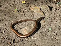 | Blindschleiche[38] | Anguis fragilis | Die Blindschleiche ist eine beinlose Echse, die bis zu 45 cm lang wird. Sie ist grau bis braun gefärbt mit dunklen Längslinien und bringt 8–25 lebende Junge zur Welt. Ihr Lebensraum sind Schonungen, Himbeerschläge und feuchte Plätze, ihre Nahrung besteht aus Regenwürmern und Nacktschnecken.[34] | ![]() |