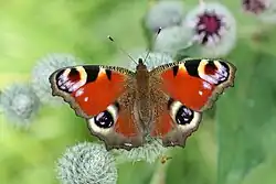 | Tagpfauenauge[45] | Aglais io | Die Oberseite der Flügel dieser bis zu 55 mm großen Falter ist rostrot mit je einem charakteristischen Augenfleck auf dem Vorder- und dem Hinterflügel. Die Unterseiten der Flügel sind dunkelgrau bis schwarz gefärbt.[50] | |