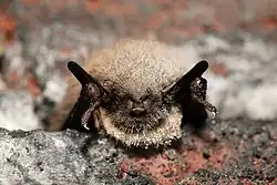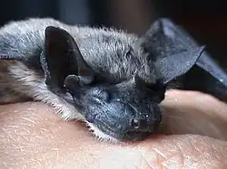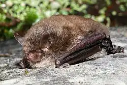 | Zwergfledermaus[15] | Pipistrellus pipistrellus | Die Zwergfledermaus hat eine Größe von 3,3–5,2 cm und eine Unterarmlänge von 28–35 mm. Sie ist an der Oberseite braun mit hellerer Unterseite, die Ohren sind dreieckig, die Flügel schmal. Sie überwintert in Höhlen und Dachböden und wird 20 Jahre alt.[30][31] | ![]() |