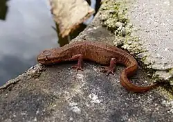 | Teichmolch[35] | Lissotriton vulgaris | Dieser häufige Molch besiedelt stehende Gewässer aller Art. Er wird bis zu 11 cm groß, ist bräunlich und die helle Bauchseite weist dunkle Flecken auf.[37] | ![]() |