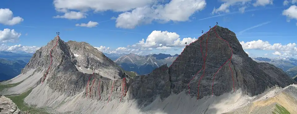 | Tinzenhorn von Südwest (Westwand, Westgrat, Südwand) | ||