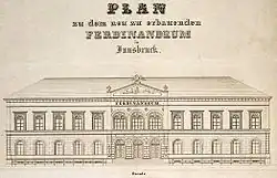Das Tiroler Landesmuseum Ferdinandeum in Innsbruck, nach dem damaligen Kronprinzen Ferdinand (seit 1835 Kaiser Ferdinand I.), der das Protektorat übernahm, auch einfach Ferdinandeum genannt, wurde 1823 unter dem Namen Tirolisches Nationalmuseum als Verein gegründet. Einer der Initiatoren war Erzherzog Johann.[3] Das erste, ursprüngliche Museumsgebäude schuf 1842 bis 1846 der Innsbrucker Stadtbaumeister Anton Mutschlechner (1785–1846). Dieses wurde 1884–1886 erweitert und umgebaut.[4] Es ist eines der fünf Häuser der Tiroler Landesmuseen.