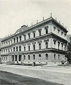 Das 1842–1845 errichtete und 1882–1884 aufgestockte Gebäude ist ein monumentaler Bau im Stil der Neorenaissance mit einem flachen Mittelrisalit mit Kuppel und einem dreiachsigen Portalvorbau. Die beiden Sphingen seitlich der Vorhalle stammen vom Bildhauer Franz Baumgartner (1903). Der dreigeschoßige Haupttrakt schließt mit den später errichteten Querflügeln einen rechteckigen Hof ein. Der mittlere Teil des Haupttraktes springt zum Hof halbrund vor und ist mit einer Kuppel gedeckt.[9]