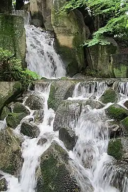 - Drachentor-Wasserfall (龍門の瀧, Ryūmon-no-taki), auch 龍門瀑 geschrieben, soll mit Steinen aus der Nebenresidenz der Owari in Edo am Toyama-Hügel angelegt worden sein.