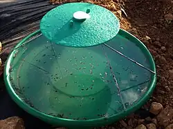 Kulturkontrollen: Wichtig für das frühzeitige Auffinden von Befall ist auch die genaue Kontrolle der Kultur selbst. Dazu wird der Bestand wöchentlich einmal vollständig abgegangen.[3] Zur Registrierung des ersten Flugs und der Anwesenheit der Tomatenminiermotte werden Fangfallen mit Pheromondispenser zum Anlocken und Abtöten der Männchen verwendet.[32] Spezielle Pheromone zum Anlocken der Tomatenminiermotte sind bereits verfügbar. Pheromonfallen werden in Großbritannien zur Bekämpfung bei einer Population von weniger als 1 bis 3 Mottenfängen pro Woche empfohlen. In Spanien wurden auch populationsmindernde Effekte mit massenhaftem Aufstellen dieser Fallen erzielt.[1] Dies erfolgt im Treibhaus mit 25 und im Freiland mit 40 Pheromonfallen pro Hektar. Aufgestellt in einem Abstand von maximal 25 m.[14] Als Pheromon benutzt man wird eine Mischung aus zwei Lockstoffen (90:10 Mischung von (3E,8Z,11Z)-3,8,11-tetradecatrien-1-yl acetate und (3E,8Z)-3,8-tetradecadien-1-yl acetate).[33] Um das erste Auftreten und die Stärke der Entwicklung gut zu registrieren, wird eine wöchentliche Kontrolle der Fallen empfohlen. Dabei werden gefangene Tiere entfernt und die Anzahl registriert. Die Pheromonkapseln sind 4 Wochen brauchbar. Die Populationsstärke wird in 4 Stufen eingeteilt: kein Risiko (0 Tier gefangen), geringes Risiko (weniger als 10 Tiere pro Falle und Woche), moderates/steigendes Risiko (3 bis 30 Fänge pro Falle und Woche) und erhöhtes Risiko (über 30 Fänge pro Falle und Woche).[14] Besonders in Ländern, in denen bisher noch keine Motten gefunden wurden, werden Abpackbetriebe, die Importe aus Italien, Spanien und Marokko verarbeiten mit Pheromonfallen überwacht.[1][34]