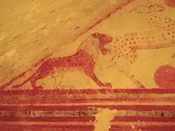 Das Grab wurde 1874 entdeckt und besteht aus einer einzigen Kammer, zu der man über eine steile Treppe gelangt. Die schräge Decke zeigt rote Blüten auf weißem Grund. In der Mitte befindet sich ein roter Streifen, der mit Kreisen dekoriert ist. Der Giebel der Rückwand zeigt in der Mitte eine Stütze und links und rechts davon jeweils einen Löwen (rechts männlich, links mit Mähne und Zitzen), der dabei ist, eine überdimensionierte Gazelle zu erlegen.