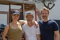 Tomy Wigand (Mitte) mit Henriette Richter-Röhl und Max von Pufendorf 2018 bei Dreharbeiten zu Weingut Wader