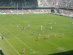 Im Sommer 1999 nahm Tonga erstmals an der Pacific Rim Rugby Championship teil, einem Turnier für Mannschaften im pazifischen Raum, und belegte dabei den fünften Platz unter sechs Teilnehmern. Als Vorbereitung auf die WM-Endrunde empfing Tonga im Juni 1999 zuhause Frankreich und gewann überraschend mit 20:16.[41] Die vier Monate später folgende Weltmeisterschaft 1999 fand in den Ländern der Five Nations statt. Zum Auftakt mussten sich die Tongaer erwartungsgemäß Neuseeland geschlagen geben (9:45). Im zweiten Vorrundenspiel erzielten sie einen knappen 28:25-Sieg gegen Italien. Schließlich kam eine klare 10:101-Niederlage gegen England hinzu, was den dritten Platz in der Gruppe ergab.[42]
