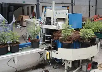 Nachdem die Töpfe befüllt sind, werden mit einem Bohrsystem Löcher für die Pflanzen gebohrt, die Erde wird mit Düngemittel versorgt und weiter auf ein Förderband geleitet. Hier stehen Menschen oder Roboter, die Pflanzen in die Löcher stecken. Schnell arbeitende Maschinen können bis zu 7000 Töpfe pro Stunde befüllen.
