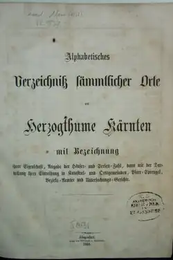 - Alphabetisches Verzeichniß sämmtlicher Orte im Herzogthume Kärnten mit Bezeichnung ihrer Eigenschaft, Angabe der Häuser- und Seelen-Zahl, dann mit der Darstellung ihrer Einreihung in katastral- und Ortsgemeinden, Pfarr-Sprengel, Bezirks-Aemter und Untersuchungs-Gerichte. Klagenfurt 1860, 321 S.[1]