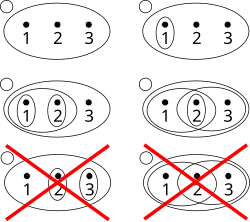 Beispiele und Gegenbeispiele zu Topologien – die sechs Abbildungen stellen Teilmengen der Potenzmenge von {1,2,3} dar (der kleine Kreis links oben ist jeweils die leere Menge). Die ersten vier sind Topologien; im Beispiel unten links fehlt {2,3}, unten rechts {2} zur Topologie-Eigenschaft.