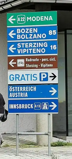 Die Amtlichkeit der Toponyme zeigt dabei graduelle Abstufungen: Der offizielle Status der meisten italienischen Namen ist gesetzlich abgesichert. Er fußt einerseits auf dem Namensdekret von 1923 aus der Zeit des italienischen Faschismus, andererseits auf dem Vorhandensein in den amtlichen[11] topografischen Karten des Militärgeographischen Instituts. Die Verwendung der deutschen und ladinischen Toponyme wird prinzipiell im Südtiroler Autonomiestatut behandelt: Artikel 101 sieht vor, dass die öffentliche Verwaltung gegenüber den deutschsprachigen Bürgern die deutschen Ortsnamen verwenden muss, wenn ein Landesgesetz ihr Vorhandensein festgestellt und die Bezeichnung genehmigt hat; Artikel 102 gewährt der ladinischen Bevölkerung das Recht auf Wahrung ihrer Ortsnamen. Allerdings sind die deutschen und ladinischen Toponyme de jure nicht bestätigt, da sie in keinem den Sachverhalt regelnden Dekret oder Landesgesetz aufscheinen.[10]
