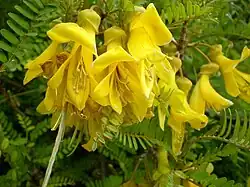 Die einzelstehenden, gelben Blüten sind etwa 2 Zentimeter lang und besitzen zehn Staubblätter. Die bis zu 10 Zentimeter langen Hülsenfrüchte enthalten jeweils vier bis fünf Samen.[3]