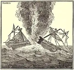 Zeitgenössische künstlerische Darstellung eines Torpedoversuchs 1805, die Brigg Dorothea sank innerhalb von zwanzig Sekunden (Robert Fulton)