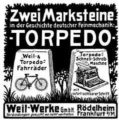1906 begann die Herstellung von Schreibmaschinen, zunächst mit einem von der Firma Johann Völker & Co. aus Neu-Isenburg übernommenen Modell, das jedoch stetig weiterentwickelt wurde. Die Schreibmaschinen wurden unter dem Namen Torpedo vertrieben. Am 30. November 1921 wurden die Weil-Werke in eine Aktiengesellschaft umgewandelt. 1927 erschien mit dem Modell Torpedo Standard die erste deutsche Schreibmaschine mit Segmentumschaltung. Das Modell konnte mit Schreibwagen verschiedener Länge geliefert werden. Seit 1931 befand sich die Aktienmehrheit der Torpedo-Werke AG im Besitz der Remington Rand Inc., New York.