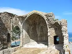 - Von der gotischen Kirchenruine bei der Festung sind Apsis, Reste des Langhauses und des rechten Querhauses erhalten.