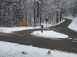 | Einmündung der Kalmithöhenstraße (hinten) in die Totenkopfstraße am Gebirgspass Hüttenhohl | |