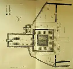 Auf der Tempelterrasse erheben sich auf einem 60 Meter breiten, 43 Meter tiefen und 5 Meter hohen Podium die obere Halle, das Ambulatorium und der Kernbau.