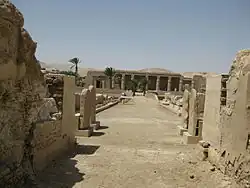 Es handelt sich um eine klassische Tempelanlage, bestehend aus einem ersten und zweiten Pylon, dem Tempelgebäude und einem Gebäude mit Magazinräumen, einem Brunnen und dem Tempelpalast. Betritt man den Tempel durch den ersten Pylon, findet man dahinter auf beiden Seiten die Überreste je einer großen Sphinx. Auf der linken Seite befindet sich der Tempelpalast.