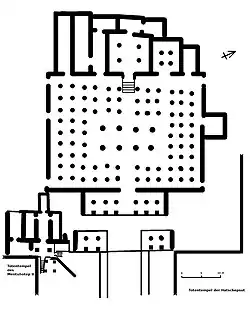 Die Überreste der Mauerfundamente und von Säulen westlich hinter dem Hypostyl lassen vermuten, dass der Tempel hier in drei Hauptteile getrennt war, von denen jeder seinen eigenen Prozessionsweg durch die Halle besaß. Der zentrale Teil war zweifellos Amun gewidmet und enthielt die Halle mit vier Säulen für die heilige Barke des Amun, in der diese während seines Besuchs im Tempel aufbewahrt wurde, dahinter den Opfertischraum und schließlich in längs laufender Achse das Sanktuar.[11]