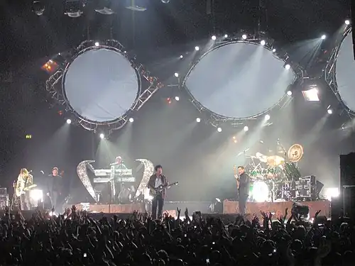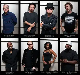 ![]() Toto in der Besetzung aus dem Jahr 2012 einschließlich der Backgroundsänger Jenny Douglas-McRae und Mabvuto Carpenter | |