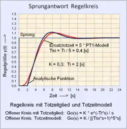 Das nebenstehende grafische Bild zeigt die Sprungantwort eines Regelkreises mit einer Regelstrecke für ein Totzeitmodell im Vergleich mit einem Totzeitglied.