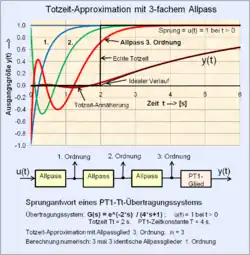 Das nebenstehende grafische Bild zeigt die Sprungantwort eines Allpassgliedes 3. Ordnung als Totzeitmodell in Reihenschaltung mit einem PT1-Glied . Das Zeitverhalten der Sprungantwort des Gesamtsystems wurde numerisch über die jedem Einzelsystem zugeordnete Differenzengleichung berechnet.
