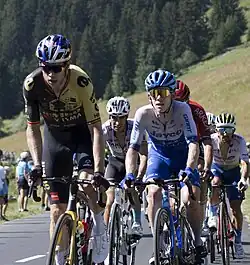 Marc Soler greift im Anstieg des Col des Aravis an und setzte sich erfolgreich von der Ausreißergruppe abDie Verfolgergruppe um Wout van Aert (links) verfolgt Marc Soler