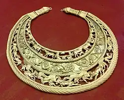 Einer der Funde war ein goldenes Pektorale mit einem Durchmesser von 30,6 cm und einem Gewicht von 1150 g, das Szenen aus dem Alltagsleben der Skythen und Tiermotive darstellte. Es wurde zusammen mit einem eisernen Schwert in einer goldverzierten Scheide in einem kurzen Korridor gefunden, der eine der Grabkammern mit der Eingangsgrube verband. Die Herstellungstechniken waren Gießen nach dem Wachsausschmelzverfahren, Prägen, Gravieren, Filigranarbeiten, Löten und Einlegen mit farbigen Emails. Das Pektorale wurde im zweiten Viertel des 4. Jahrhunderts v. Chr. von griechischen Kunsthandwerkern im Auftrag des skythischen Adels als diplomatisches Geschenk angefertigt, zum Beispiel in den Schmuckwerkstätten von Athen oder Pantikapaion. Es wurde als „eine Symphonie und eine Geschichte in Gold“ beschrieben und wurde angeblich von einem skythischen König getragen.[2][6][5]