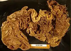 Bedingt durch die autoreaktive Antwort der eingewanderten Granulozyten weisen Mucosa und Submucosa multiple Ulcera auf. Dadurch entstehen vor allem bindegewebige Nekrosen, die zu Dilatation und Perforationen des Kolons führen können.
