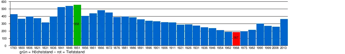 Die Gemeinde gehörte nie zu den bevölkerungsreichsten Orten der Region. Zwischen 1793 und 1831 verlor sie deutlich an Bewohnern (1793–1831: - 25,8 %). Danach kam es zu einer zwei Jahrzehnte dauernden starken Wachstumsphase (1831–1851: + 74,9 %). Das Jahr 1851 war dann auch das Jahr des höchsten Bevölkerungsstands. In den fünf nachfolgenden Jahren wanderten viele Bewohner ab – doch erholte sich die Einwohnerzahl in der Wachstumsphase von 1856 bis 1866 teilweise wieder. In den folgenden 106 Jahren kam es zu einem dauernden Bevölkerungsrückgang durch Abwanderung (1866–1968: - 61,4 %). Die Grenze von 200 Einwohnern wurde unterschritten. Die beiden Wachstumsphasen von 1975 bis 1990 und seit 2008 führten zu einem markanten Anstieg der Anzahl Bewohner (1975–2013: + 96,3 %).