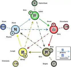 An zweiter Stelle ist die Qi-Dynamik in einen Kreislauf eingebunden, der nach dem Muster von fünf Jahreszeiten verläuft. Jeder Kreis (Funktionskreis (TCM) oder Orbis) geht aus einem vorherigen hervor und in den nächsten über. Es entstehen Gegensätze und Paare etwa nach dem Muster des Verhältnisses zwischen Großmutter und Enkel. Den Jahreszeiten sind fünf Elemente zugeordnet: Holz, Feuer, Erde, Metall und Wasser. Der menschliche Organismus schließlich wird als ein Zusammenwirken von fünf „Organen“ (Funktionskreisen) begriffen, von denen jedes seinen besonderen Bezug zu einem der fünf Elemente und einer der fünf Jahreszeiten hat. Die fünf Organe/Funktionskreise sind im Modus des Auseinander-Entstehens miteinander verbunden: Leber, Herz, Milz, Lunge und Nieren. Diese Organe/Funktionskreise decken sich nur teilweise mit dem uns vertrauten Begriff. Im „Herz“ zum Beispiel ist neben dem Organ als Pumpe das Vermögen zur treffenden Form eingeschlossen. Physisches und Psychisches gehen oft ununterscheidbar ineinander über. Der wichtigste Unterschied zum wissenschaftlichen Verständnis ist: Die fünf Organe/Funktionskreise sind ein sich selbst erfüllendes Ganzes, ein Mikrokosmos als Abbild eines Makrokosmos, der mit seinen Jahreszeiten und Elementen mit dem individuellen Organismus verknüpft ist. Die Organe/Funktionskreise verhalten sich zum Organismus wie die fünf Jahreszeiten zum Zyklus des Entstehens und Vergehens und die fünf Elemente (fünf Wandlungsphasen) zum Ganzen des materiellen Seins.