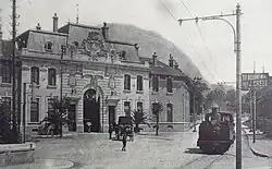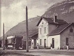 ![]() im Bahnhof Crolles, 1901 Zwei Triebwagen und ein Gepäckwagen mit 1.-Klasse-Abteil des T.G.C. im Bahnhof Crolles, 1901 | |