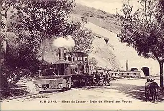 Die Dampflokomotive Jeanne konnte sechs große, trichterförmige eiserne Wagen ziehen, die mit Erz gefüllt waren. Diese Wagen hatten einen beweglichen Boden und transportierten jeweils 5 bis 10 Tonnen.[12] Die Societe Anonyme des Mines du Zaccar nahm 1912 eine der ersten B-B-Garratt-Lokomotiven in Betrieb.[13][14][15] Am 4. August 1926 wurde ein Dekret erlassen, wonach die am 24. Dezember 1925 durch den Präfekten von Algier vorgenommene Rekonzessionierung und Änderung der Betriebsbedingungen der Feldbahn von Miliana nach Margueritte genehmigt wurde.[16]