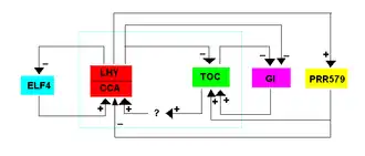 Eine zweite Schleife besteht aus PRR9, PRR7 und PRR5, die alle Homologe von TOC1 sind und die CCA1- und LHY-Expression unterdrücken. Diese PRR-Gene werden direkt von LHY und TOC1 unterdrückt. Diese Gene werden auch durch den Evening Complex (EC) reguliert, der aus LUX ARRHYTHMO (LUX), EARLY FLOWERING 3 (ELF3) und EARLY FLOWERING 4 (ELF4) besteht. LUX ist ein Transkriptionsfaktor mit einer ähnlichen Funktion wie MYB, während ELF3 und ELF4 Kernproteine sind, deren Funktionen unbekannt sind. Der Evening complex fördert indirekt die Expression von LHY und CCA1, wodurch die Transkription der eigenen Komponenten unterdrückt wird. Da dieses Modell aus zwei Hemmungen besteht, die zu einer Aktivierung führen, wird es auch als Repressilator bezeichnet.[9]