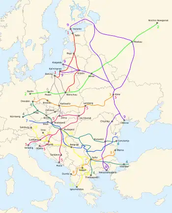 Hamburg – Berlin Rostock – Berlin – Dresden Bremerhaven / Wilhelmshaven – Magdeburg – Dresden Dresden – Ústí nad Labem – Mělník / Prag – Kolín Kolín – Pardubice – Brno – Wien – / – Bratislava – Budapest – Arad – Timișoara – Craiova – Calafat – Vidin – Sofia Sofia – Plovdiv – Burgas Plovdiv – Grenze Türkei Sofia – Thessaloniki – Athen – Piraeus – Lemesos – Lefkosia Athen – Patras / – Igoumenitsa |