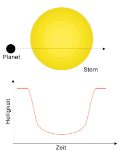 Während eines Planetentransits verdeckt der Planet für einen geeignet gelegenen Beobachter einen Teil seines Muttersterns, sodass die Helligkeit des Sterns während des Transits reduziert ist. Durch fortwährende Beobachtung der Helligkeit eines Sterns lassen sich diese Veränderungen nachweisen. Der Planet, welcher einen Transit hervorruft, wird Transitplanet (englisch transiting planet) genannt. Planeten umkreisen ihren Stern auf ihrer Bahn innerhalb einer bestimmten Umlaufdauer, sodass nach einem Umlauf erneut ein Transit stattfindet. Um ein zufälliges Ereignis auszuschließen, müssen mindestens drei Transits mit gleichem zeitlichen Abstand zueinander beobachtet werden. Obwohl die Wahrscheinlichkeit einen Transit bei einem zufällig ausgewählten Stern zu beobachten mit weniger als 1 %[2] recht gering ist, weil die Umlaufbahnen auch so orientiert sein können, dass der Planet von der Erde aus gesehen nie vor seinem Stern vorbeizieht, wurden bis 2024 mit dieser Methode über 4000[1] Exoplaneten nachgewiesen. Aus der Beobachtung der Helligkeitsverläufe der Sterne lassen sich weitere Informationen über den Planeten und den Stern gewinnen. So sind beispielsweise Aussagen über die Umlaufdauer um seinen Stern, den Planetenradius, die Bahnneigung seiner Umlaufbahn gegenüber der Sichtlinie und über die Rotationsrichtung seines Sterns möglich. Darüber hinaus lassen sich aus der Kenntnis dieser Werte Aussagen über den Abstand treffen, in dem der Planet seinen Stern umkreist. Bei spektroskopischer Beobachtung lassen sich auch Daten über die Zusammensetzung seiner Atmosphäre und über seine Albedo und Temperatur gewinnen. Bisher wurden aufgrund des Signal-Rausch-Verhältnisses hauptsächlich massereichere Planeten untersucht, die ihren Stern auf deutlich engeren Bahnen als im Sonnensystem umkreisen. Die Verfahren und Instrumente werden jedoch laufend verbessert mit dem Ziel erdähnliche Planeten zu untersuchen. Stand 2024 bietet das James-Webb-Weltraumteleskop die besten Möglichkeiten für solche Untersuchungen. Es befinden sich zusätzlich einige Großteleskope auf der Erde in der Planungs- und Bauphase, welche derartige Untersuchungen ebenfalls erlauben werden. Das erste davon wird das sich im Bau befindliche European Extremely Large Telescope [3] sein.