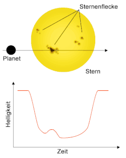 Von Inhomogenitäten im Magnetfeld des Sternes werden bei gebündeltem Austreten von Feldlinien aus der Sternenoberfläche Sternenflecken verursacht. Diese erscheinen dunkler und reduzieren, ebenso wie ein Transit, die Helligkeit des Sterns. Ist die Bahnneigung eines Transitplaneten bekannt, ist sein Weg über die Sternenscheibe bekannt. Befindet sich auf dieser Linie ein Sternenfleck, bedeckt der Planet während seines Durchgangs ebenfalls den Fleck. Da der Fleck eine geringere Helligkeit als die ihn umgebende Oberfläche des Sterns aufweist, ist der gesamte Helligkeitsabfall bei verdecktem Fleck kleiner, als wenn der Planet und der Fleck sichtbar sind. Die Helligkeitskurve weist also bei Vorhandensein eines Sternenflecks auf dem Weg des Planeten eine Anhebung auf. Handelt es sich um einen Transitplaneten mit einer geringen Umlaufperiode im Bereich von wenigen Tagen, lässt sich diese Anhebung mehrfach beobachten, da Flecken auf dem Stern im Bereich von mehreren Tagen bis zu Wochen für einen Umlauf benötigen. Auch lässt sich eine Rotation des Sterns und eine Verschiebung des Flecks auf der Oberfläche des Sterns nachweisen, wenn die in der Helligkeitskurve sichtbare Anhebung im Laufe mehrerer Transits weiterwandert. Besitzt ein Stern Transitplaneten mit sehr geringer Umlaufdauer, können damit Daten über seine Sternenflecken gewonnen werden, indem möglichst viele Transits ausgewertet werden. Über die Häufigkeit des Auftretens und die Größe der beobachteten Sternenflecken sind Rückschlüsse über die magnetische Aktivität des Sterns möglich.[19][20][21]