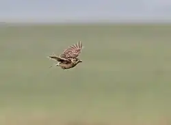 Der lerchentypische Fluggesang besteht aus kleinen Phrasen, die nur jeweils eine knappe Sekunde dauern und in Abständen von fünf bis sechs Sekunden wiederholt werden. Der Singflug dauert zwischen einer Minute und einer halben Stunde. Die Männchen stehen dabei entweder rüttelnd im Wind oder fliegen Kreise mit einem Durchmesser von 20 bis 40 Metern.[4]