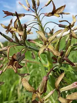Das waagrecht abstehende bis überhängende Schötchen ist 4 bis 14 Zentimeter lang.[1]