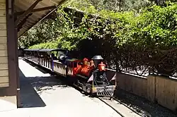 Eine Parkeisenbahn mit einer Spurweite von 406 mm (16 Zoll) umrundet das Museumsgelände. Die Fahrkarten gelten jeweils für zwei Runden.[52] Dort wurde früher der Zug Melody Ranch Special betrieben, der einmal Gene Autry gehört hatte, nach dessen Film Melody Ranch der Zug benannt wurde. Die Personenwagen sind heutzutage überdacht und die ursprüngliche Dampflokomotive, die nach einem Sabotageakt nicht mehr wirtschaftlich reparierbar war, wurde durch eine wie eine Dampflokomotive aussehende Diesellokomotive mit dem Namen Courage ersetzt. Auf dem Nachbargrundstück gibt es im zwei weitere unabhängig vom Travel Town Museum betriebene Parkeisenbahnen: Die Griffith Park & Southern Railroad mit 18½ Zoll (470 mm) Spurweite und die Parkeisenbahn des Los Angeles Live Steamers Railroad Museum mit 7½ Zoll (190,5 mm) Spurweite.[53]