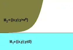 Hat man zwei disjunkte konvexe Mengen in , von denen eine offen ist, so gibt es zu diesen nach der zuletzt genannten Version des Trennungssatzes ebenfalls eine Hyperebene, so dass die beiden Mengen in unterschiedlichen Halbräumen liegen. Im Allgemeinen kann man aber nicht mehr erreichen, dass beide im Inneren der Halbräume liegen. Dazu betrachte man in die untere Halbebene und die offene Menge oberhalb des Graphen der Exponentialfunktion . Wie durch nebenstehende Zeichnung verdeutlicht, ist mit die einzige trennende Hyperebene, und liegt nicht im Inneren des zugehörigen Halbraums.