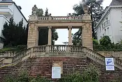 Der Treppenaufgang ist zweiarmig und dreiläufig in neobarocken Formen aus rotem Sandstein ausgeführt. Die Balustraden bestehen aus gelbem Aachener Sandstein, die Treppenstufen aus Kunststein. In die Stützmauer ist als Steinrelief das Bonner Stadtwappen eingearbeitet. Dem Treppenaufgang ist eine Torüberbauung als Portikus in Form einer Triumphpforte – ebenfalls in gelbem Aachener Sandstein – aufgesetzt, die von Pfeilern und zwei Säulenpaaren getragen wird. Überdimensionale Vasen bekrönen die Pfeiler, den Portikus als Ganzes eine Balustrade.[2]