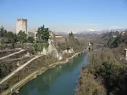 Die Trezzo-Brücke wurde von 1370 bis 1377 im Auftrag des Herrn von Mailand Bernabò Visconti errichtet.[1] Sie diente als Zugang zu einer Visconti-Burg über den Fluss Adda und war mit Türmen bewehrt.[1] Bereits 1416 wurde sie während einer Belagerung durch Schwächung eines der Brückenwiderlager absichtlich zum Einsturz gebracht.[1]
