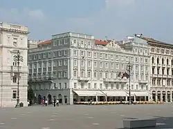 Wappen von Triest auf dem einst von der Marinesektion des k.u.k. Kriegsministeriums genutzten Amtsgebäude Marxergasse 2 in Wien. Im amtlichen Gebrauch der k.u.k. Marine wurden die Namen in italienischer Sprache verwendet.