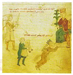 Richard Löwenherz küsst die Füße Heinrichs VI. (aus Petrus de Ebulo: Liber ad honorem Augusti, 1196)